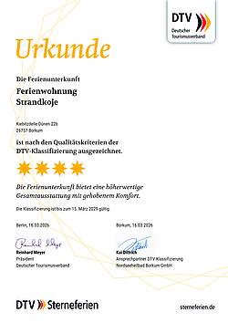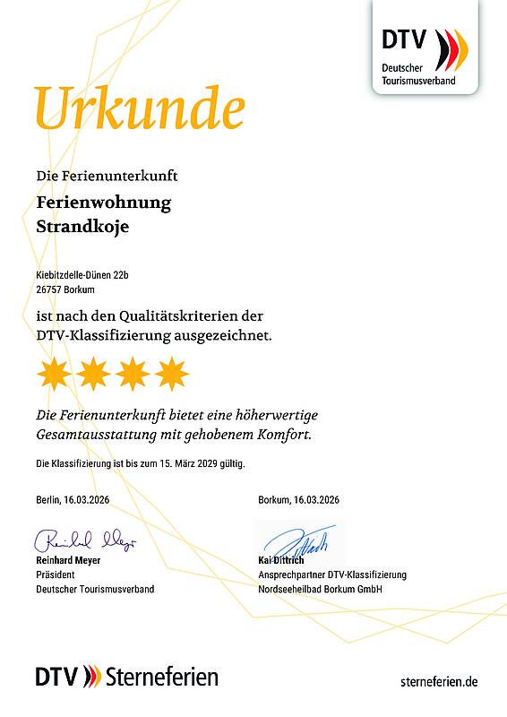 Die Ferienwohnung „Strandkoje“ ist nach der Klassifizierung des Deutschen Tourismusverbandes e.V. (DTV) mit Vier Sternen ausgezeichnet worden.